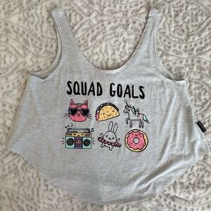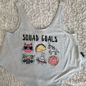 activewear and dancewear. The tank top pictured features the brand's name and the text "SQUAD GOALS," accompanied by cartoon graphics of a cat, taco, unicorn, boombox, rabbit, and donut.