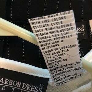 New with tags. Sag Harbor brand Women’s Size 12P 2 pc set consists of a solid white sleeveless shell that goes on over the head and a black with white vertical pinstripe blazer jacket. Blazer features notched collar that has white piping contrast, 2 non-working front pockets, front buttons, Washable polyester and rayon blend jacket while shell is 100% polyester. Showing photos of font and back sides along with fiber contents and care information.