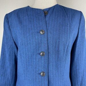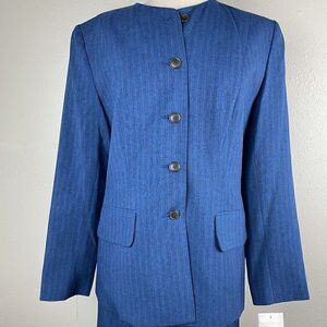 Beautiful and stylish matching blue blazer jacket and skirt by Sag Harbor Suits. The jacket measures 20 inches armpit to armpit laying flat and 27 inches in length shoulder to hem. The skirt measures 15 inches at the waist laying flat and is 28 inches in length.