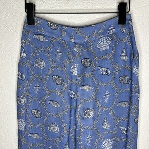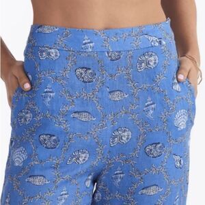 Our Milo Trouser in Coral Lapis is straight-leg cropped-length linen trousers. It is inspired by the cabinet of curiosities vintage shell collection encased within sea blue coral windows on a lapis cotton base.