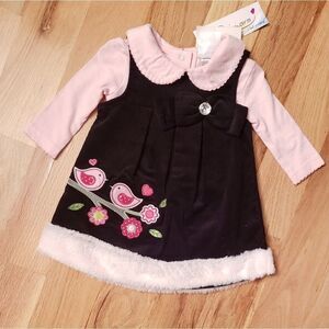 New with tags. Black micro cord Corduroy Jumper with a faux fur hem applique love birds design. Comes with pink long sleeve Peter Pan collar onesie also. Size 3 months