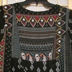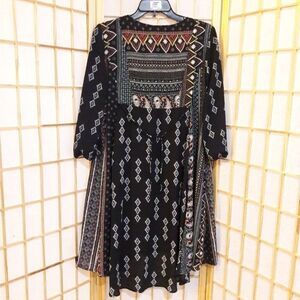 This is a Womens Sami & Jo Boho, Hi Low, Lined Dress size S. The shirt measures 18 1/8 inches armpit to armpit, from top of the collar to the hem 34 inches front, 39 inches back and the sleeves are 3/4 with elastic cuffs.