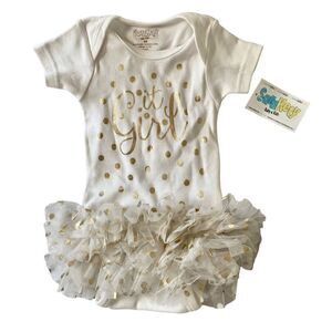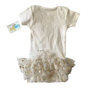 NWT Sara Kety “It Girl” Body Suit with Ruffle Tutu Gold design on whit 100%cotton. Great gift. Size:6m