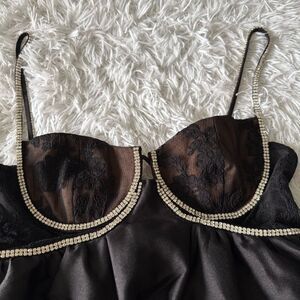 NWT Self-Portrait Black Taffeta Diamante Mini Dress with Lace Trim Size 10