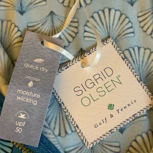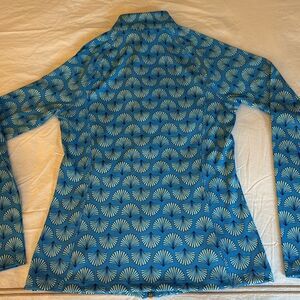 NWT Sigrid Olsen women’s golf tennis full zip jacket in blue palm fan pattern. Features long sleeves, mock neck, zippered pockets, Goldtone hardware, quick drying moisture wicking fabric, UPF 50 sun protection.