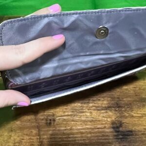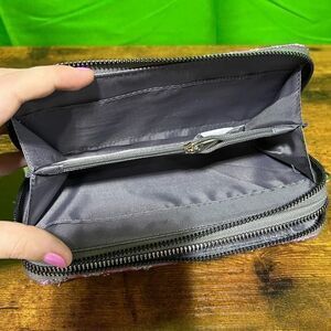 This crossbody is the perfect small bag to carry. Front pocket is big enough to put your phone or a small set of keys. 2 zippered pockets - one opens completely and has several slots of cards and ID, and the other opens accordian style and has 2 spaces for cash or receipts and small zippered pocket for change. This wallet comes with a matching long crossbody strap and a wristlet strap, so you choose how to carry it.