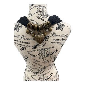 NWT Simply Genius Jewelry Scarf. Black and Antique Bronze Jewelry. . Beaded at bottom front sides and back neckline is all jewelry. Fabric is not listed but it is lightweight (see pic of it spread out). Measures 68 1/2” in total length lying flat. cute scarf accessory - would even compliment a swimsuit!