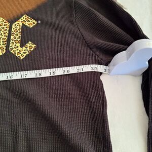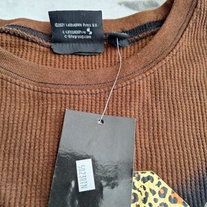 This NWT Lifegroup henley top is perfect for fans of the iconic rock band AC/DC! The top features a fun and edgy animal print and tie-dye design, adding a touch of metal to the look. The top is made from a comfortable waffle knit fabric, ensuring a loose and relaxed fit. The top is a size XL and has long sleeves, making it a great choice for cooler weather. The cropped style adds a trendy touch to the overall look. Get ready to rock and roll with this eye-catching top!