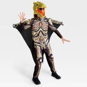 Includes skeletal dragon jumpsuit with scary mask and triangular wings