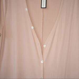 Description/Details: Button front. Ribbed. V neck. Short sleeves. Side slits.