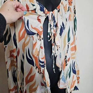 This is the ruffle tie style shirt by Standard Issue. It is new with tags, and the color/design is called Safari. This shirt is off white and has green, yellow, orange, blue, and animal print. It has long sleeves and is open in the front with a tie closure. There are ruffled details along the neckline.