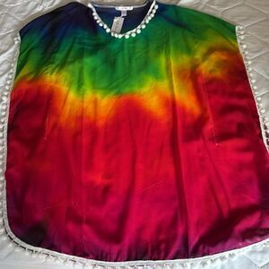 NWT Stella Cove Color-burst tie dye Pom Pom girls beach coverup poncho. Features V neckline trimmed in white pom poms. Sides are open with Pom Pom trim.