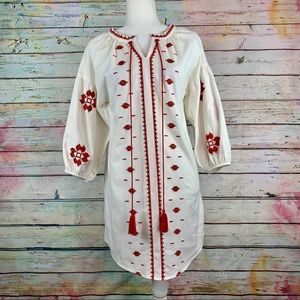New with tags, beautiful dress with red embroidery and tassels!! Flowy fit so would probably fit a small even though it’s listed as an XSM. Very boho and comfortable. Ready for a night out or festival.