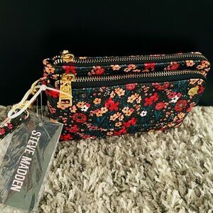 A bold and vibrant style to refresh your ensemble, the Steve Madden Trell Clutch is it. With a top zipper opening and wristlet strap, this look is perfect for life on the go. Faux-leather upper. Exterior zipper pocket logo-lined interior. Strap length 16”