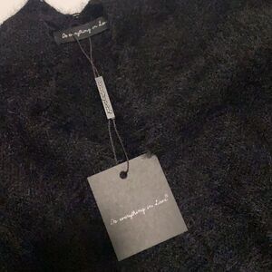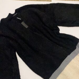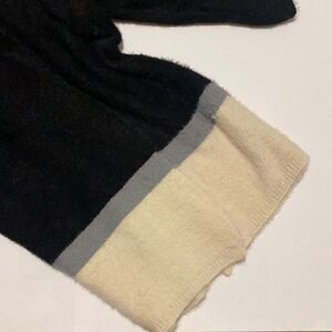 Brand new with tags color block cardigan. Fuzzy knit material with grey and cream color blocking. Sleeve is 3/4 length and has a wide opening. Open style cardigan/wrap (no buttons)