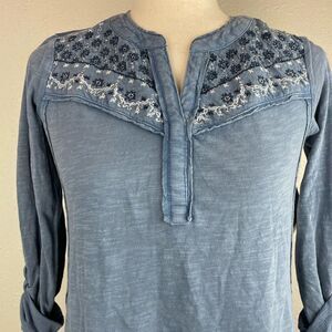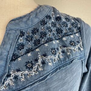 Super cute faux denim style top by Style & Co featuring a half button-down V-neck style. It measures 17 inches armpit to armpit length flat and is 22 inches in length from the shoulder to the hem.