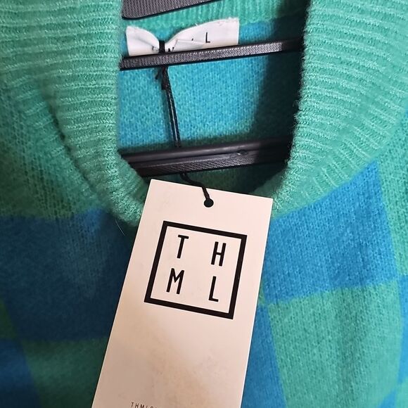 NWT THML Blue and Green Checkered Mockneck Boxy Sweater Large