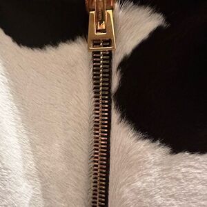 NWT- Tom Ford cow print brown and white pencil skirt in size 44. The fabric is 84% polyamide/nylon and 16% elastane. The length is 24 inches, the waist is 30 inches, and the hips measure 36 inches. It is a super cool skirt. Beautiful gold, zipper detail.