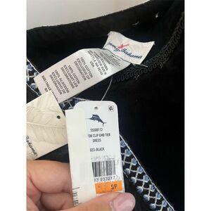 Keywords: Tommy Bahama, petite dress, summer dress, casual dress, knee-length dress, black dress, V-neck, ruffle trim, 3/4 sleeve, cotton dress, machine washable, clip embroidered, tier dress, women's fashion, new with tags.