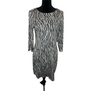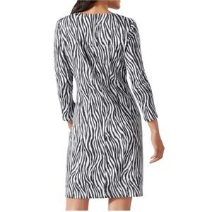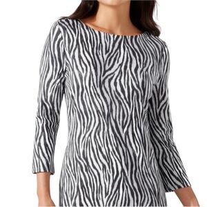 Keywords: Tommy Bahama, zebra print, chic dress, knee-length, gray dress, casual wear, spring fashion, 3/4 sleeve, round neck, lightweight fabric, elegant, comfortable, machine washable, new with tags.
