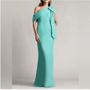 Hidden side-zip closure One-shoulder neck Sleeveless Full-length column skirt with shoulder bow.