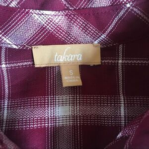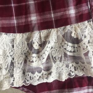 Beautiful Maroon and white plaid button down with lace and pearl buttons. I bought it but it won't fit. I would say it's pretty true to size.