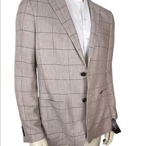 This linen jacket by Tasso Elba is NEW WITH TAGS! It’s a natural cream/tan in color with dark brown plaid with 2 button closure. The size is Medium, 39-41, fully lined and 100% linen.