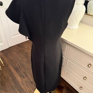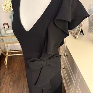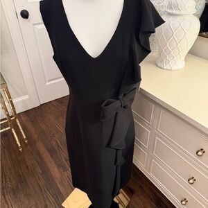 Black V-neck dress with ruffle on the left shoulder and tie at waist. This is brand new with tags and in pristine condition.