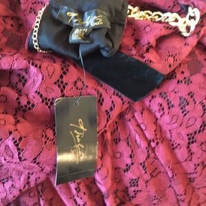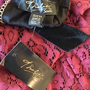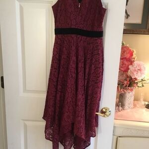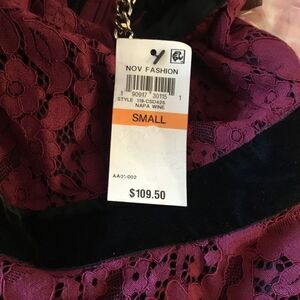 Brand new with tags Thalia Sodi/Reunited LLC brand sleeveless lace dress in “Napa Wine” the official name of the color. Fully lined in black. Features set in black velvet waistband and chain neck in goldtone. Handkerchief hem. Just spectacular! Showing photos of front and back sides along with fiber contents tag. Machine wash cold gentle cycle. Size is Small.