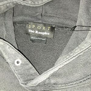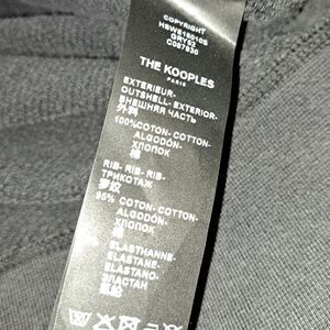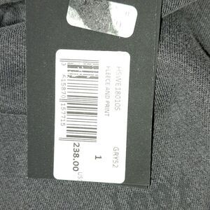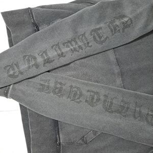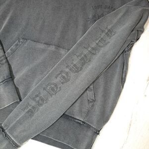 Front pocket area says "lost paradise" the sleeves say "unlimited adventure". Size is 1 which is a small in US.