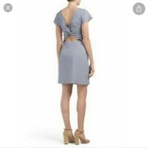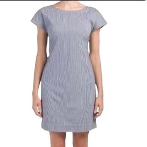 This is perfect for all things summer! The coast is calling with this seersucker dress. Open back, side zip, sheath silhouette with stretch.