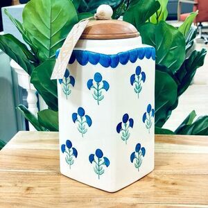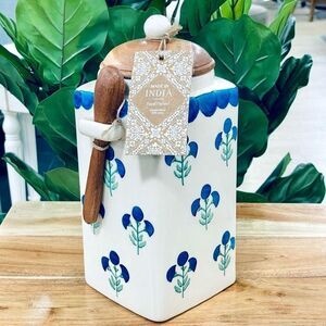 NWT Tik Tok Viral Made in India Artisan Blue Ceramic Canister w Wood Spoon & Lid