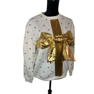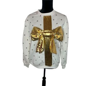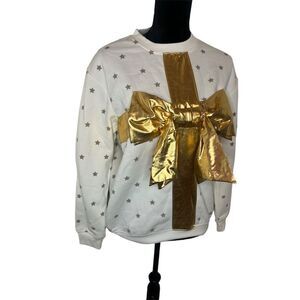 Keywords: Vinyl Icons, women's sweater, long sleeve,, gold bow, star print, casual wear, winter fashion, festive theme, soft fabric, crew neck, regular fit, holiday style, new with tags.