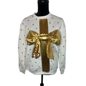 NWT UGLY CHRISTMAS SWEATER FESTIVE GOLD & WHITE PRESENT BOW WOMENS SIZE SMALL
