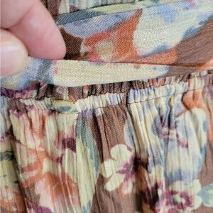 Color is called Mauve Multi. Flowy ruffled sleeves. Elastic waist with tie. Snap on the chest. Keyhole opening in the back. Chest:21" from armpit to armpit. Waist:13" from side to side, but it is elastic and will stretch. Hips:21" from side to side. Length:25.5" from the armpit down. Shell: 100% Rayon. Lining:100% Rayon.