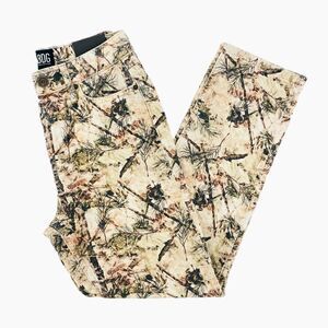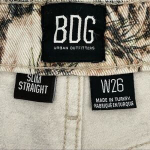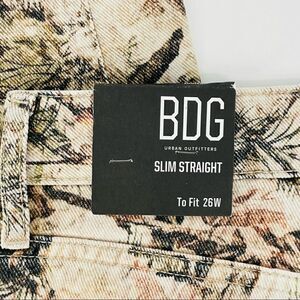 BDG by Urban Outfitters. Stunning camouflage print with pine leaves, pine cones, and branches. Cream base with green/tan/brown/blush print. Made from an authentic rigid denim that softens up over time like your favorite vintage jeans. Sits at the natural waist and is slim through the hip & thigh. Straight leg. Ankle length. Discontinued style. Smoke-free and pet-free home.