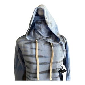 Blue and grey, drawstring hoodie, has front pocket, attached face covering, brand new, size xs