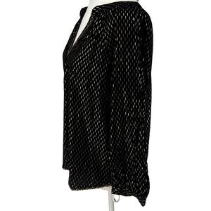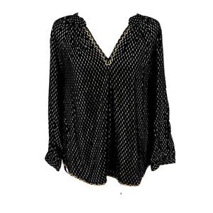Beautiful new with tags Velvet by Graham & Spencer embroidered tunic in size XS. This stunning black tunic features intricate gold-embroidered detailing along the V-neckline, creating an elegant, bohemian look. The flowing silhouette and 3/4 sleeves make this piece incredibly versatile and flattering.