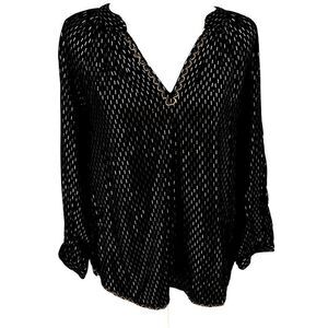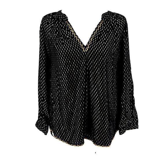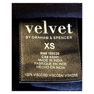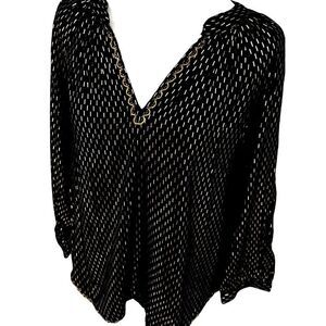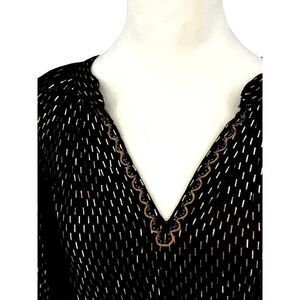 Beautiful new with tags Velvet by Graham & Spencer embroidered tunic in size XS. This stunning black tunic features intricate gold-embroidered detailing along the V-neckline, creating an elegant, bohemian look. The flowing silhouette and 3/4 sleeves make this piece incredibly versatile and flattering.