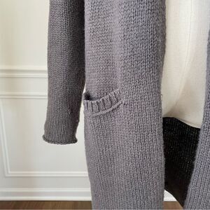 New with tags, Velvet by Graham and Spencer long open front cardigan with bucket pockets and fringe across the back. Mocha color. Knit is acrylic, wool, nylon and alpaca blend. Measurements are approximate and taken while laying flat: 38” shoulder to hem and 20” armpit to armpit with the front opening touching