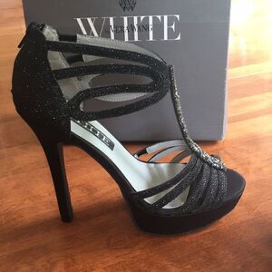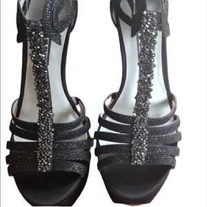 NWT Vera Wang black platform multistrap caged heels with embellished front T-strap. Size 8. About 1 1/2 inch platform and about a 5 1/4 inch heel. Comes with shoe box. Shoe box has a rip in one corner and a rip in bottom, but purchased that way. No damage to the shoes. Shoes are brand new, never been worn.