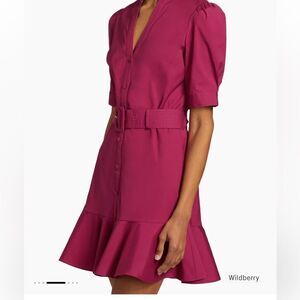 Crafted of a crisp cotton-blend, Veronica Beard's Molly minidress is finished with a self belt with a rectangular buckle. A fluted hem finishes this button-front style.
