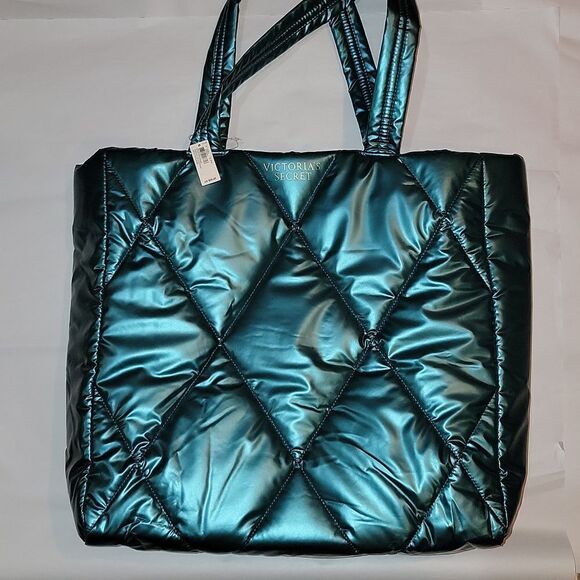 NWT Victoria's Secret Green Teal Quilted Puffer Tote Shopping Bag Handbag Purse