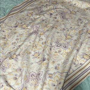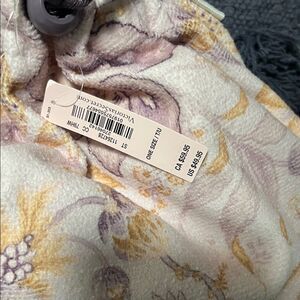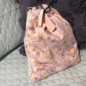 Elegant backpack with lavender floral pattern. Features drawstring closure and branded adjustable straps. Ideal for daily use.