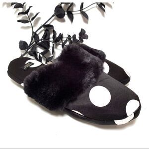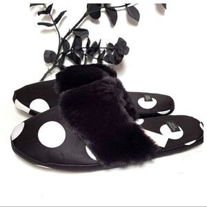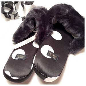 Very soft black satin Victoria’s Secret slippers with white polka dots. Black faux fur across the arch. Black rubber soles. Comes with matching bag
