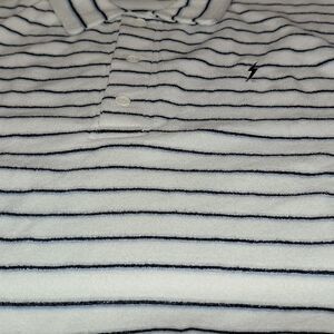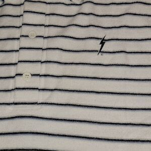 This is a absolutely fantastic opportunity to get this 100% Authentic Vintage Lightning Bolt polo style, short sleeve, collared shirt. Super soft and has a terry feel. Embroidery Lightning Bolt on chest. The sticker is still attached and will more than likely not stick due to age but a marvelous collecible that possibly can be stuck with other tape. The date is unsure, but possibly the late 70s?