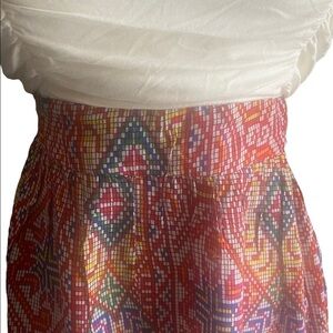 strapless dress, cream color bodice, padded top, bright color geometric print skirt, reds, oranges, blues and greens, side zipper, ties in back, excellent condition, size xl