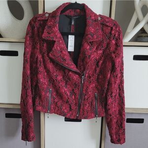 This stunning dangria lace jacket is perfect for adding a touch of elegance to any outfit. Its intricate design and bold color make it a standout piece in any wardrobe.