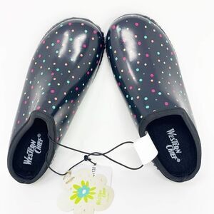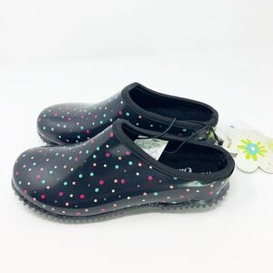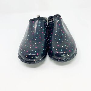 Made with natural rubber materials, Waterproof, Lightweight, Moisture absorbent lining, Removable cushioned insole, Non-tracking outsole, Polka dot print, Rubber construction, Contoured footbed, Round toe, Slip-on, Grip sole. Great clogs for gardeners. Comfortable, easily slip on & off. Cute and fun pattern.
