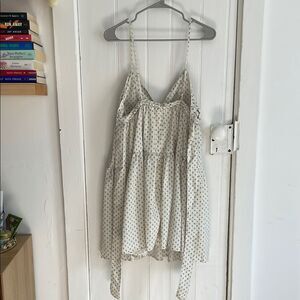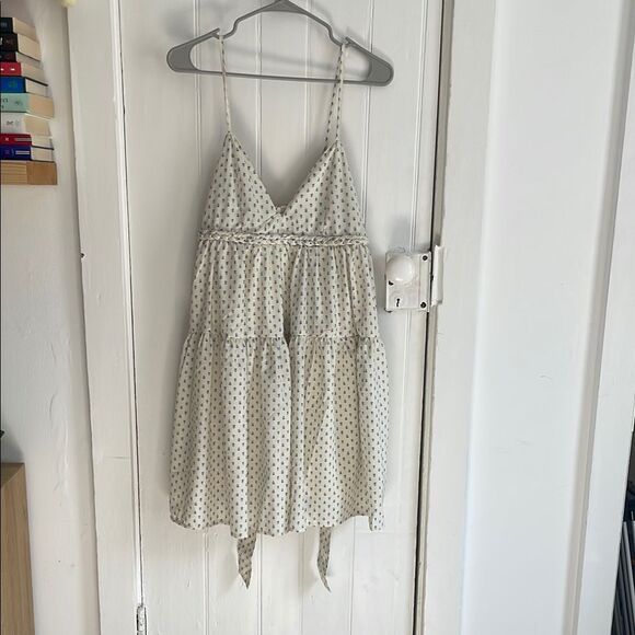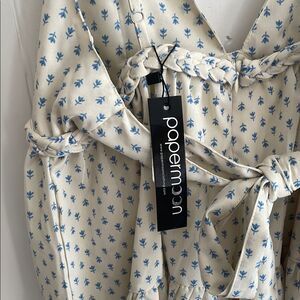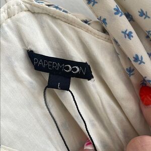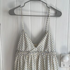 Paper Moon white sun dress with blue floral print, spaghetti straps, braid detail under the bust, back tie detail, size large (runs small), brand new with tags.